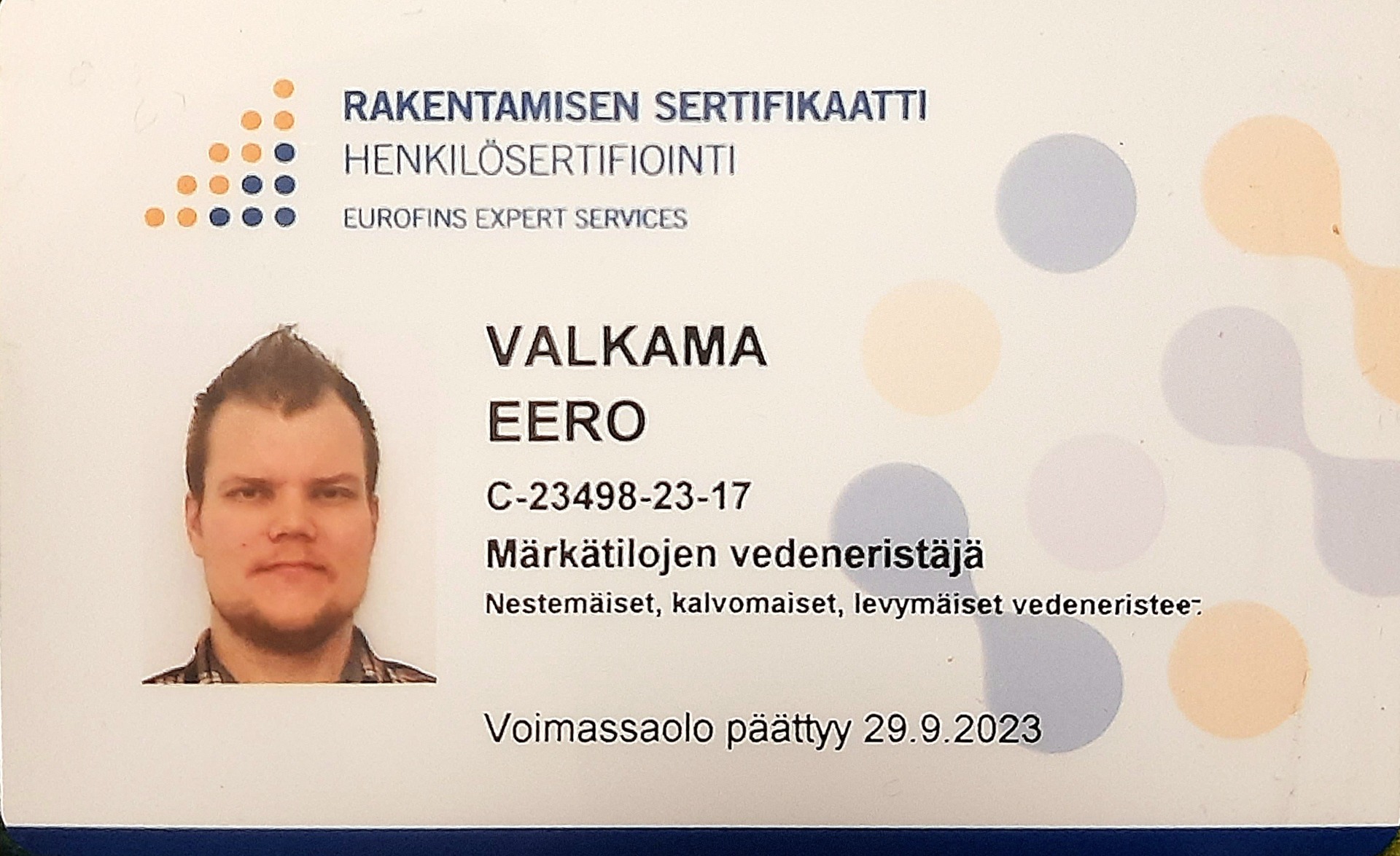 Minulta löytyy voimassa oleva vedeneristyksen sertifikaatti.